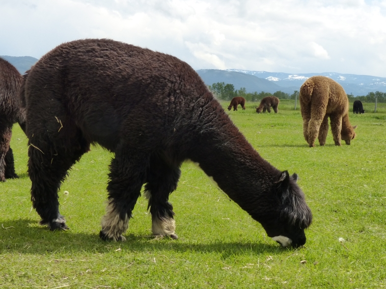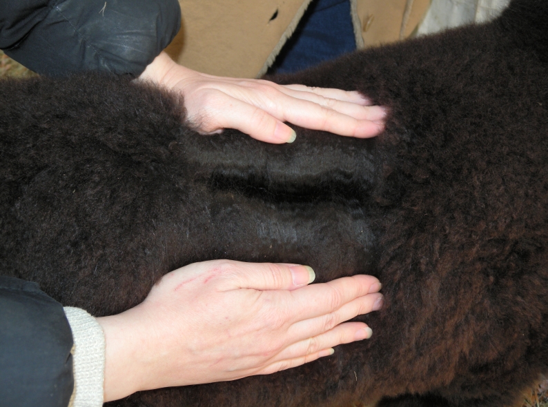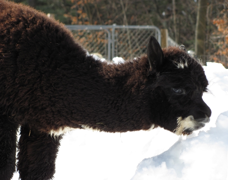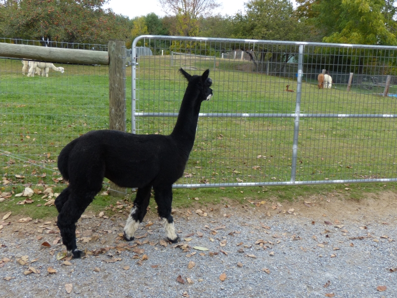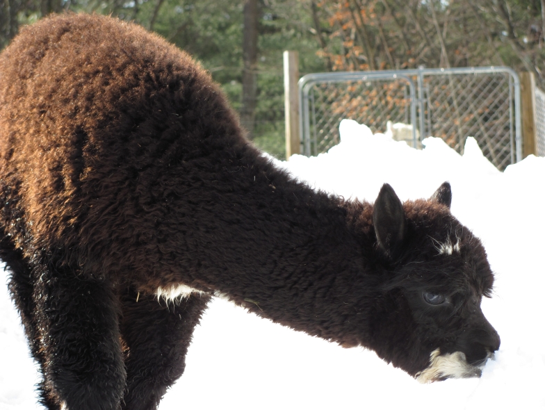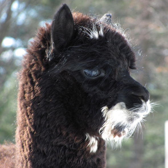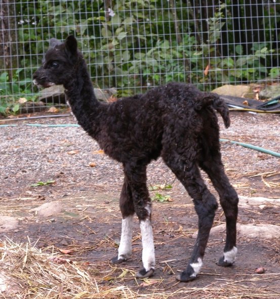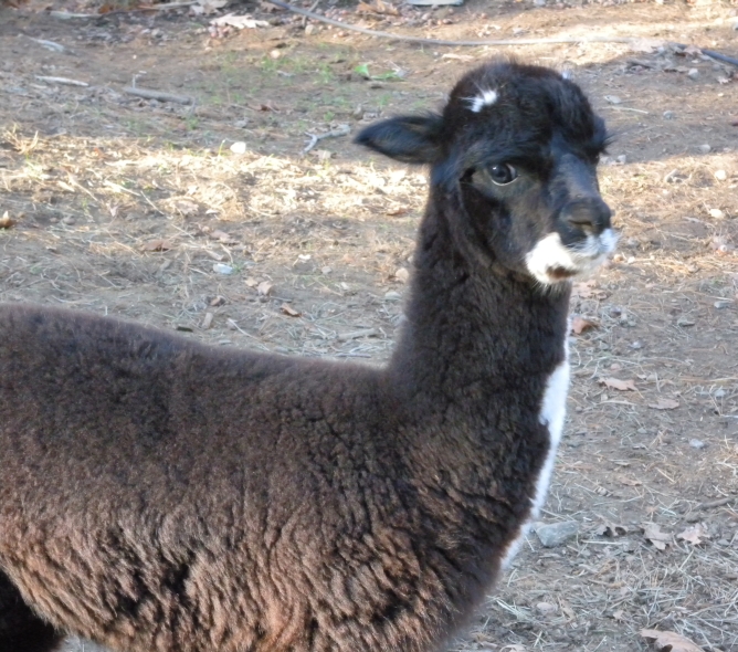 Temperment: very sweet Color (phenotype), Gender: non-fading true black and white adult male Color (genotype): true black / true black, white spot gene Breed: Huacaya ARI#: 31866804 Sire: Othello's Running Bear Dam: TKA Zoey Ancestors with 40 or more registered offspring, as of October 2010 (generations back): Pperuvian Guellermo G4546 (4), Peruvian Camilio G4561 (4), Peruvian Ion S221 ALOA (3), Peruvian White Out (5), C4 Merrill G211 (4), Peruvian Fuego G226 (5), SA Karrington (5), Ppperuvian Dante (4) Fiber description: Strong fiber. Nice handle, with an intriguing cool slick feel, and exceedingly bright (see fleece photo!). Fiber stats: