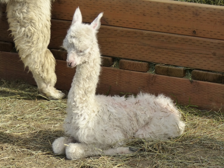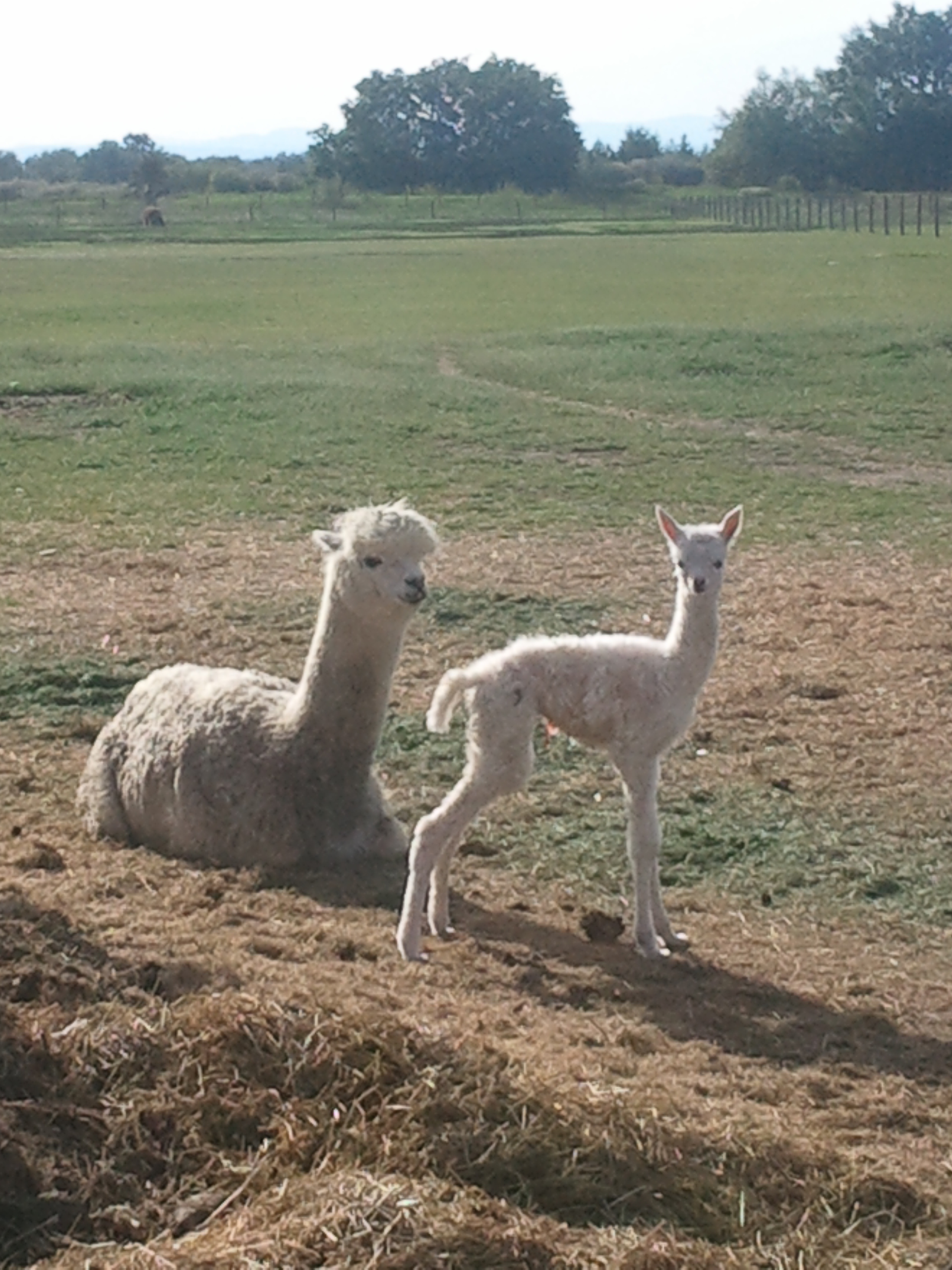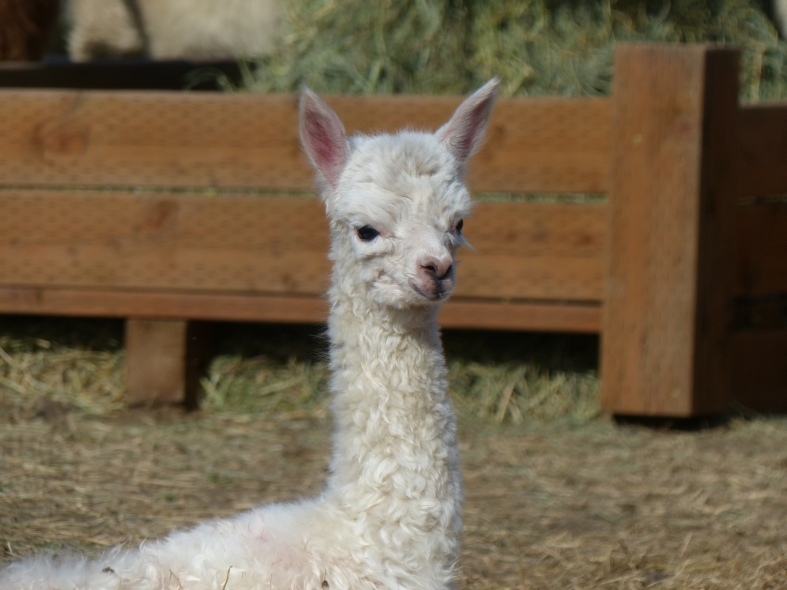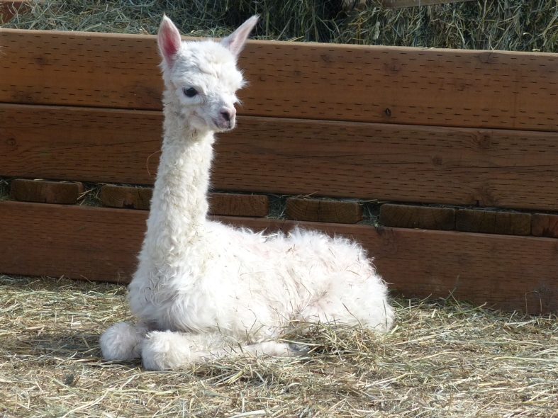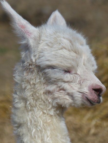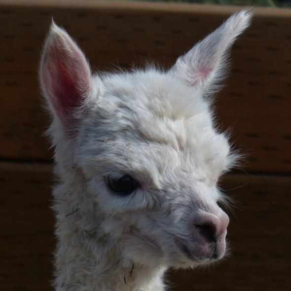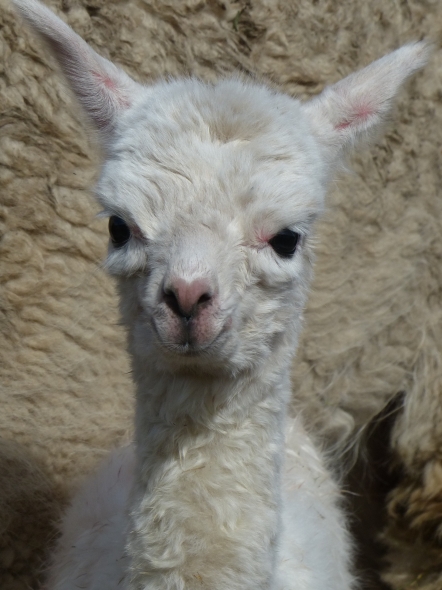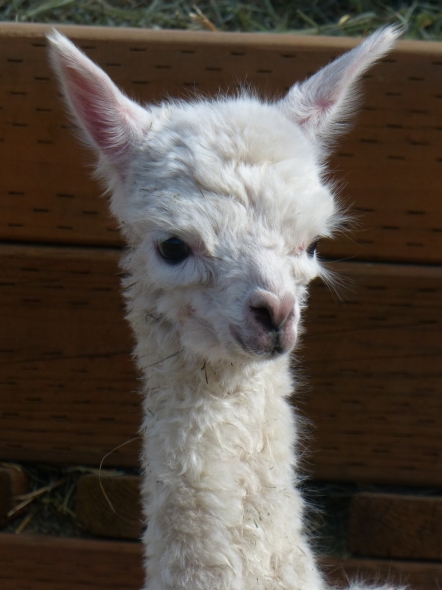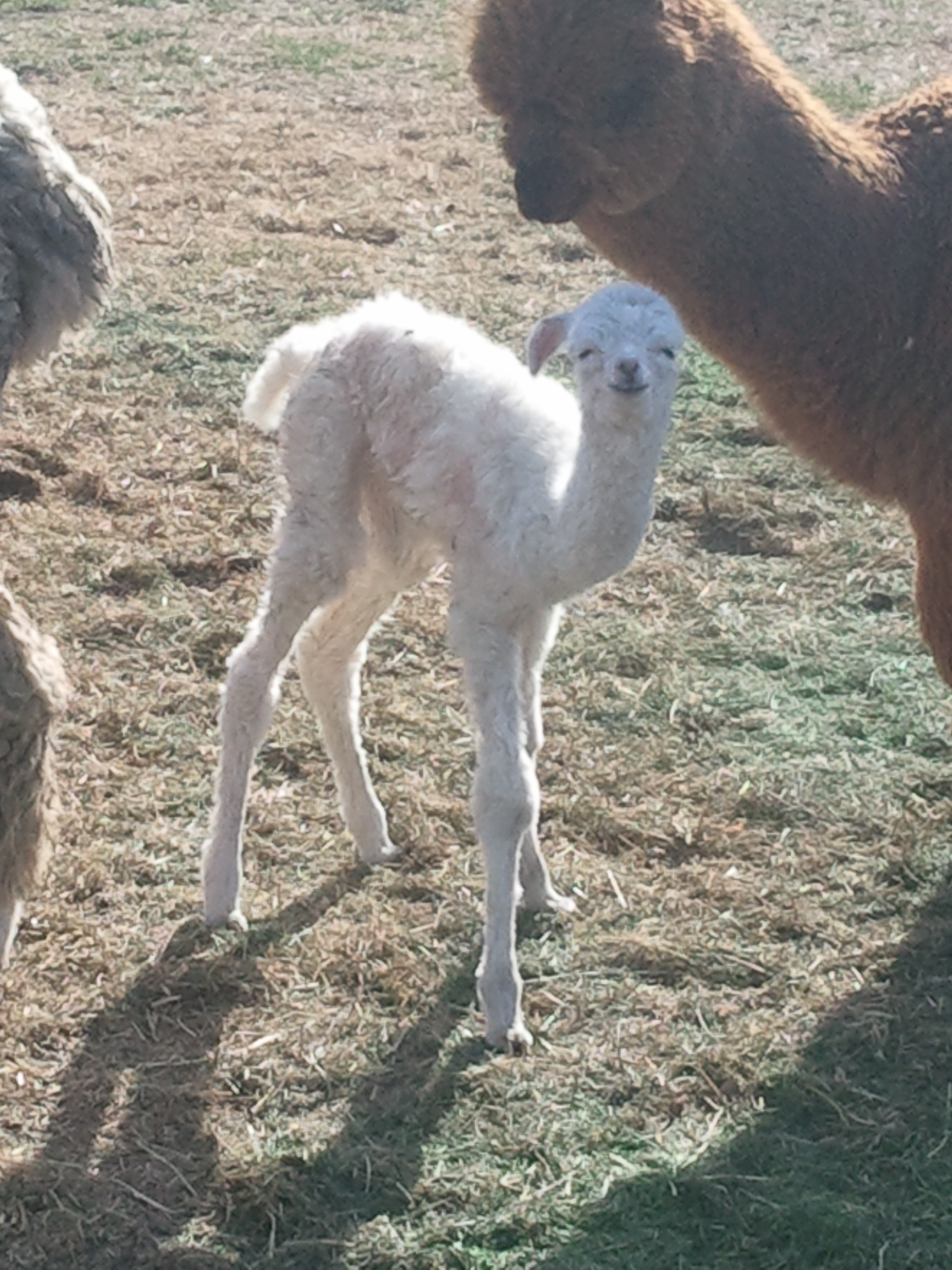 Temperment: Carries herself like a princess Color (phenotype), Gender: white maiden female Color (genotype, probable): dominant white / either black or brown, likely carries a white spot gene or two Breed: Huacaya ARI#: Pending Sire: Alpaca Orchard's Harvest Dam: Pasture Candy Chime Ancestors with 40 or more registered offspring, as of December 2013 (generations back): Uber's Diamond (5), 5Peruvian Black Ice 9069 (5), 5Peruvian Chinchero 9036 (5), Macho Fawn HST G451 (5), Peruvian Macusani (6). Also, as of October 2010 (generations back): Pperuvian Guellermo G4546 (5), Peruvian Camilio G4561 (5), Peruvian Ion S221 ALOA (4), Peruvian Fuego G226 (6), Peruvian Hemingway G171 (6), Pperuvian Felix G4562 (6), Ppperuvian El Moustachio 6003 (5), K-2 (4), Mister Antonio (5) Fiber description: silky type, glistens