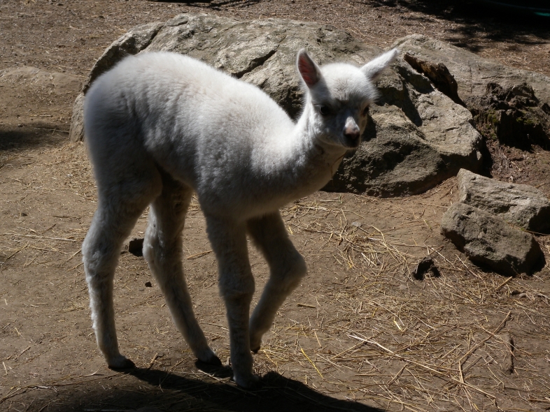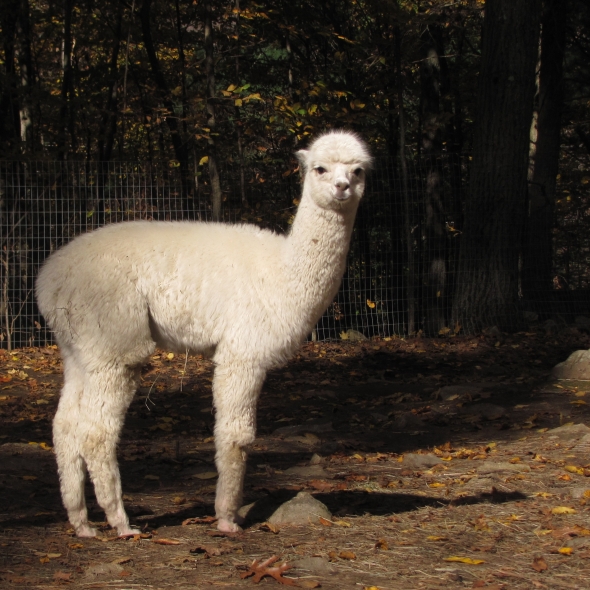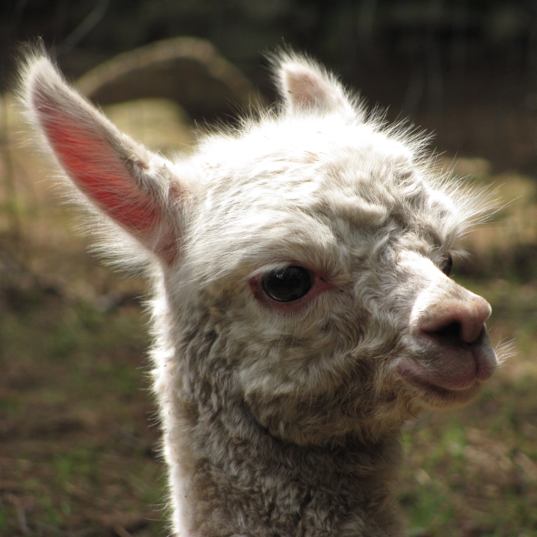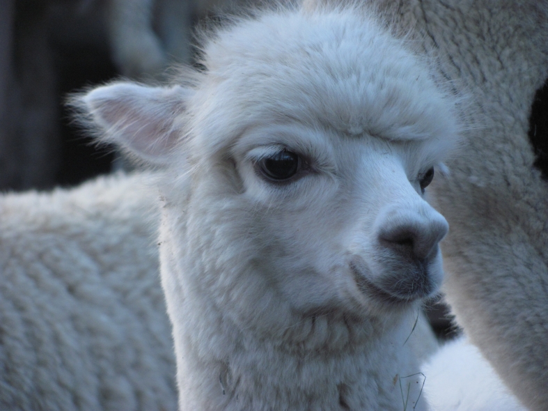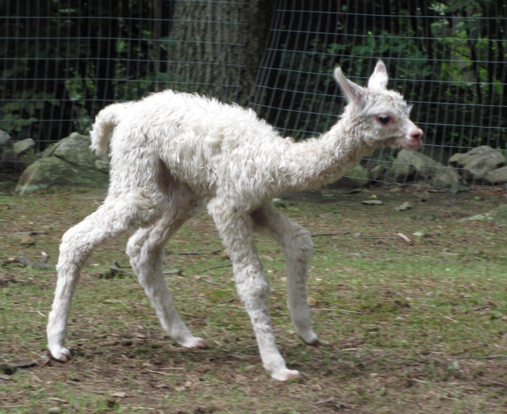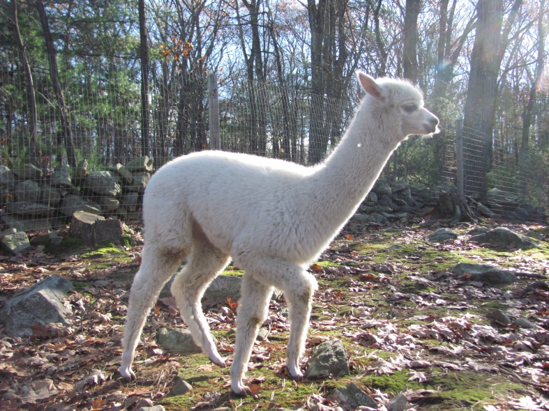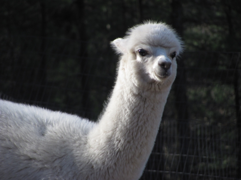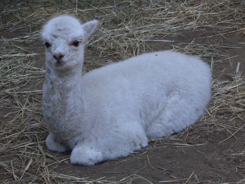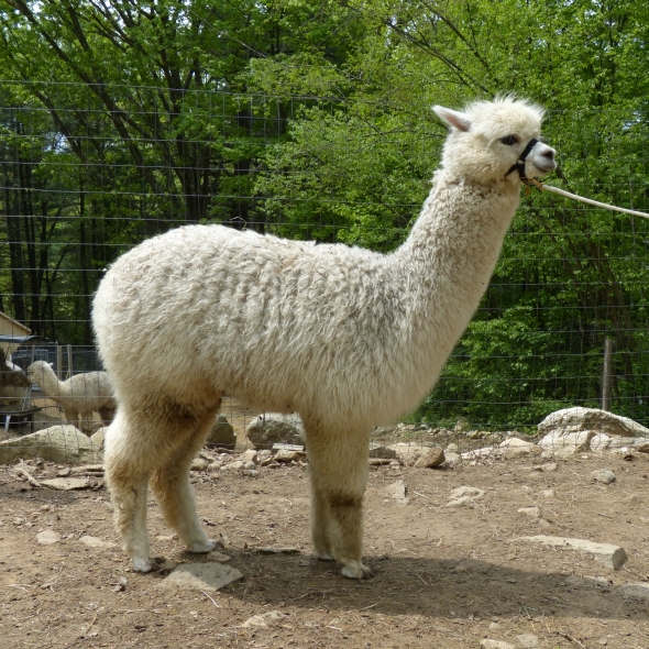 Temperment: agile, intelligent, friendly Color (phenotype), Gender: white adult female Color (genotype, probable): dominant white / either brown or black, likely carries white spot gene Breed: Huacaya ARI#: 32500806 Sire: EMA Manchester Dam: TKA Zoey Offspring born into the Pasture Candy herd: Ancestors with 40 or more registered offspring, as of October 2010 (generations back): Pperuvian Guellermo G4546 (4), Peruvian Camilio G4561 (4), Peruvian Ion S221 ALOA (3), Peruvian Fuego G226 (5), Peruvian Hemingway G171 (5), Pperuvian Felix G4562 (5), Ppperuvian El Moustachio 6003 (4), K-2 (3), Mister Antonio (4) Fiber description: Unusual silky type fiber. Soft pleasant handle, hard to describe - feels like the sorts of materials used to make baby blankets.
