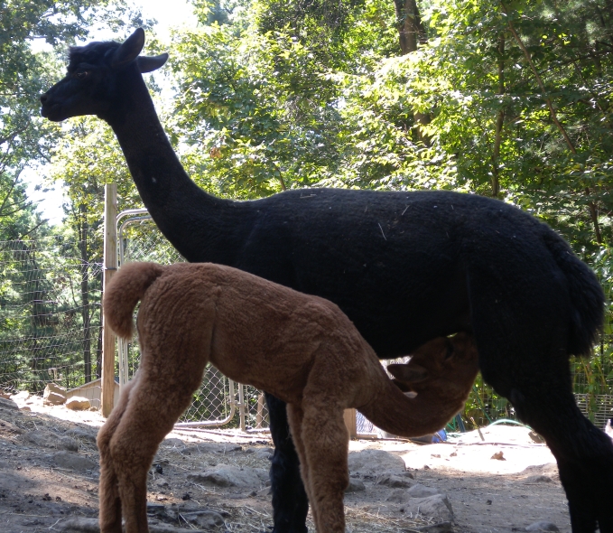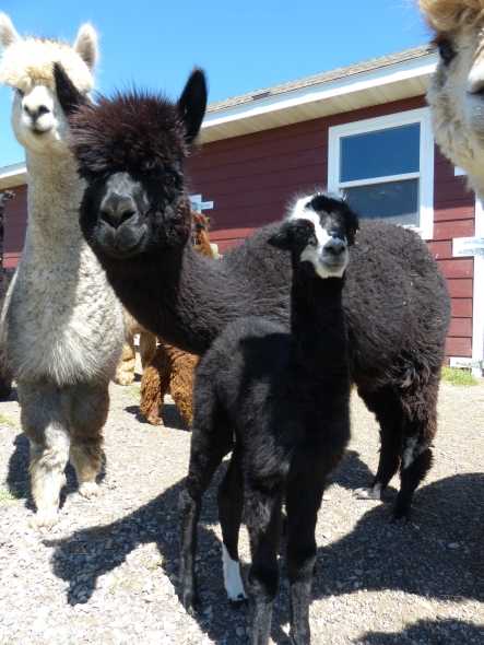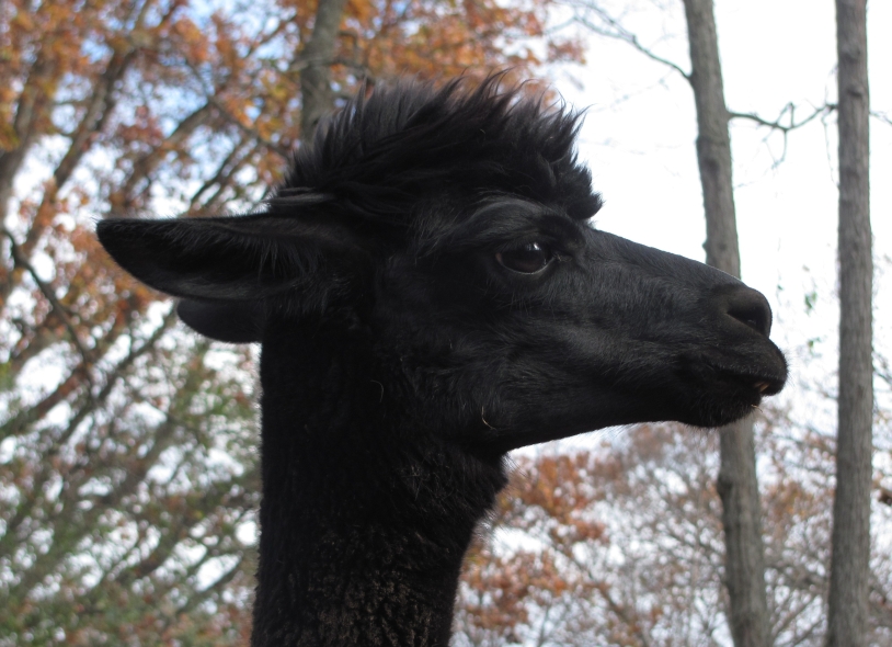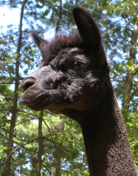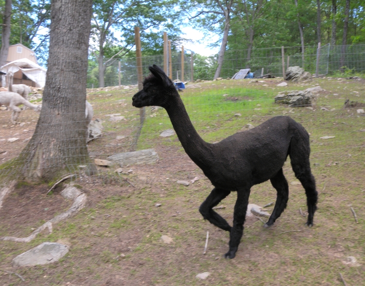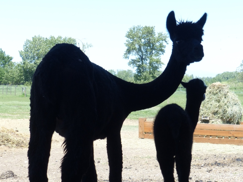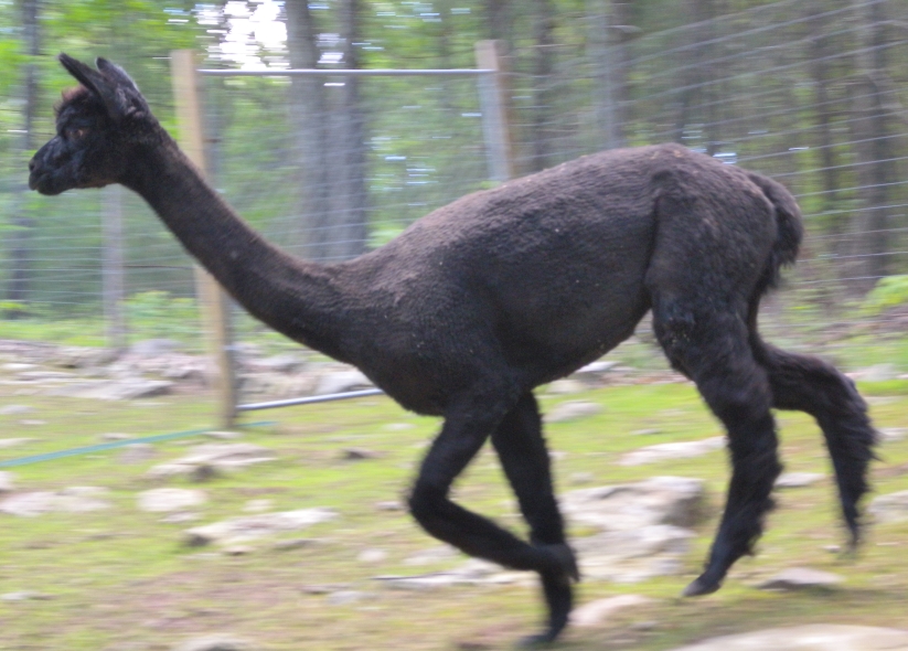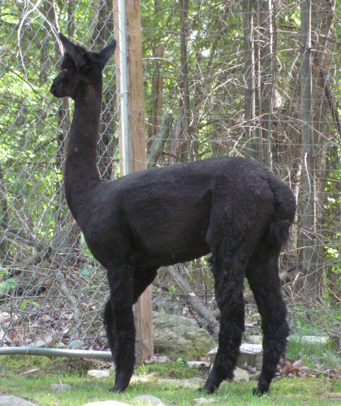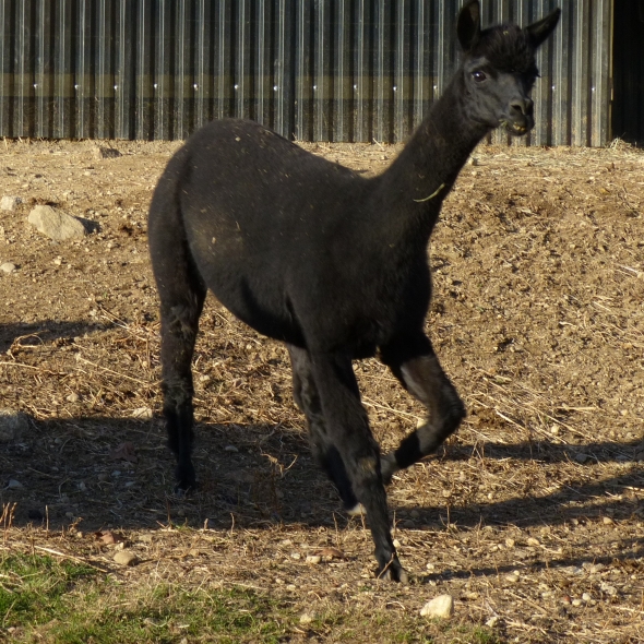 Temperment: active, intelligent Color (phenotype), Gender: non-fading true black adult female. (She is such a deep black that my cameraman had to pull out some fancy camera tricks to get any details of her to show up in her photos.) Color (genotype): true black / true black Breed: Huacaya ARI#: 31370202 Sire: Maple Brook Conundrum Dam: Natalia - Pisarata