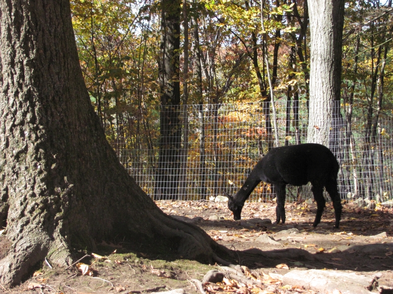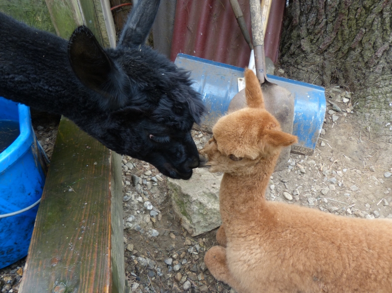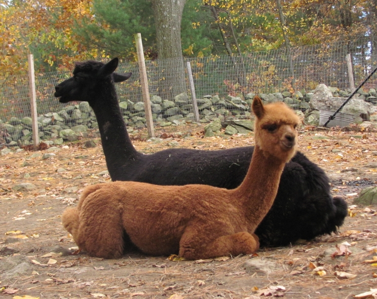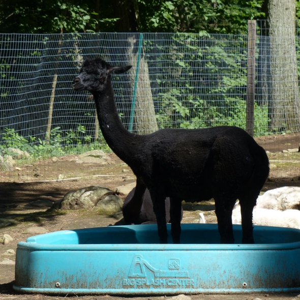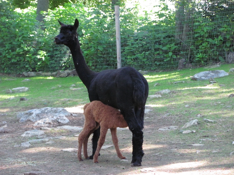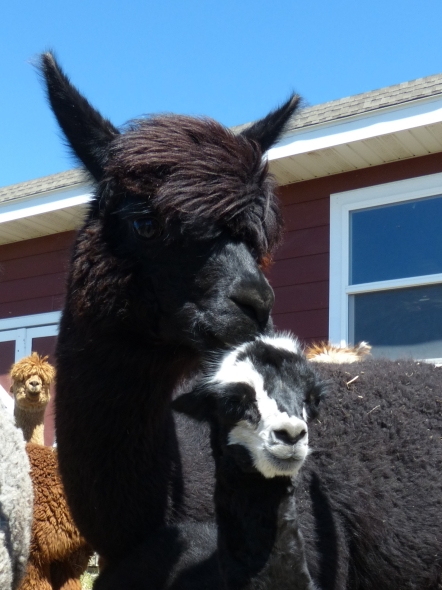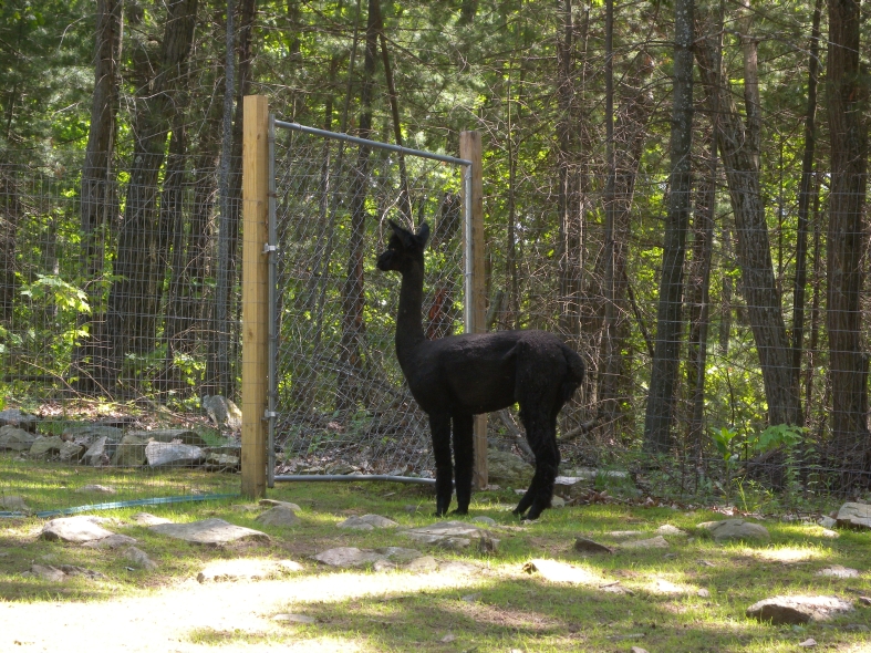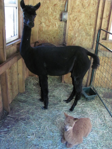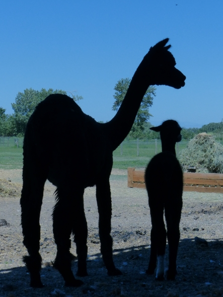 Temperment: active, intelligent Color (phenotype), Gender: non-fading true black adult female. (She is such a deep black that my cameraman had to pull out some fancy camera tricks to get any details of her to show up in her photos.) Color (genotype): true black / true black Breed: Huacaya ARI#: 31370202 Sire: Maple Brook Conundrum Dam: Natalia - Pisarata