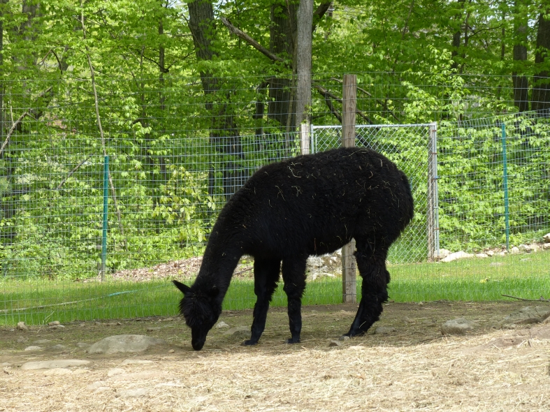 Temperment: active, intelligent Color (phenotype), Gender: non-fading true black adult female. (She is such a deep black that my cameraman had to pull out some fancy camera tricks to get any details of her to show up in her photos.) Color (genotype): true black / true black Breed: Huacaya ARI#: 31370202 Sire: Maple Brook Conundrum Dam: Natalia - Pisarata