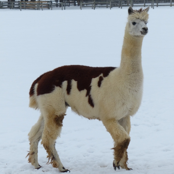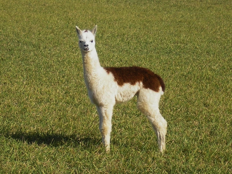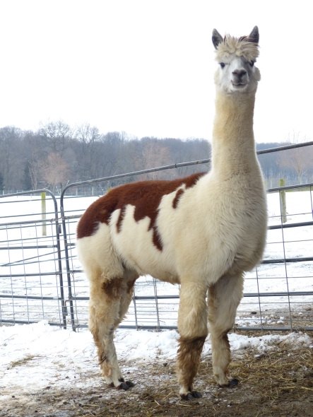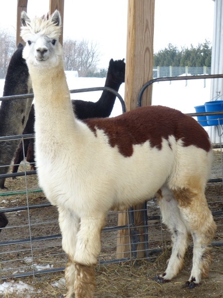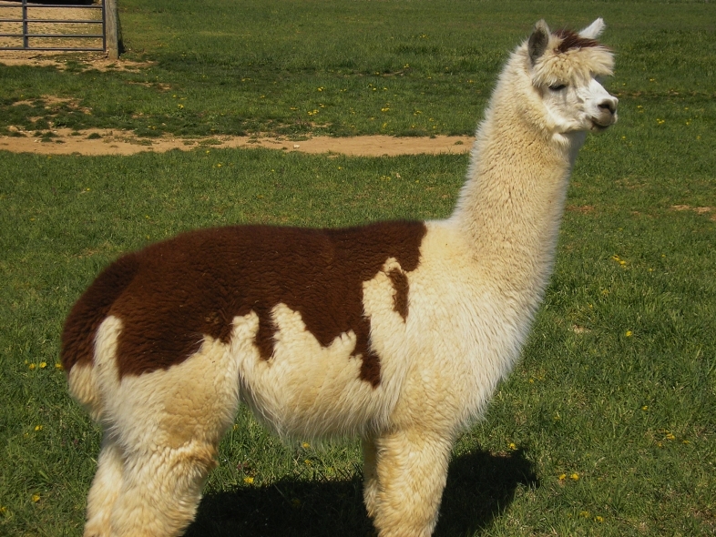 Temperment: good natured Color (phenotype), Gender: medium brown and white pinto adult male herdsire Color (genotype, probable): brown / black, two white spot genes, dilution gene Breed: Huacaya ARI#: 31861113 Sire: SP's Tap Dancer Dam: Alpaca Orchard's Seven Stars Offspring born into the Pasture Candy herd: