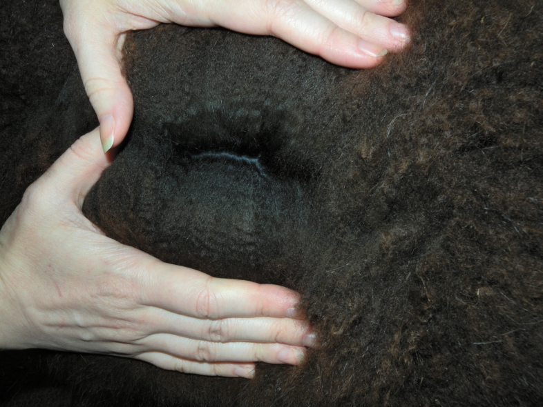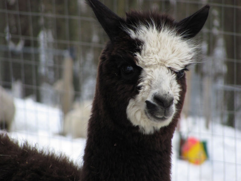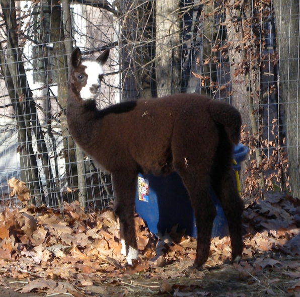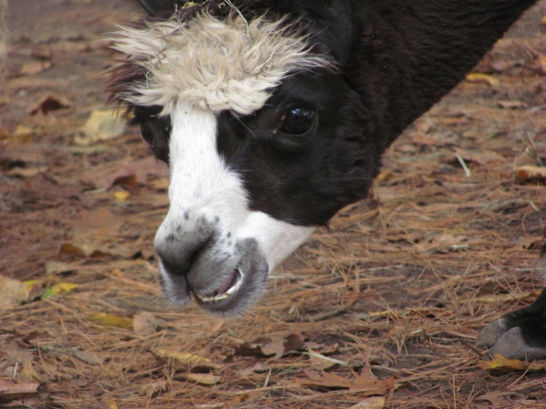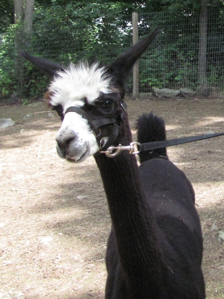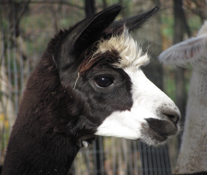 Temperment: Active and spirited. Curious to the point of bold. Resident escape artist Color (phenotype), Gender: fading true black and white adult female (Don't let the bleached tips in the photos fool you! Once she was sheared, she was a beautiful true black underneath! Although I have to say, as a fiber artist, I find the potential uses of her bi-tonal fleece to be inspiring.) Color (genotype): black / black, white spot gene Breed: Huacaya ARI#: 31893275 Sire: Great Rock Incan Prince Dam: Annie Matilda Offspring born into the Pasture Candy herd: Ancestors with 40 or more registered offspring, as of October 2010 (generations back): Peruvian Olympus (2), Brittany's Desperado (3), SA Karrington (5), Peruvian Drambuie G220 (3), Chilean Feliz Fellow (3), SA Emperado (4) Fiber description: Crimpy and wonderfully velvety soft. Soft enough that it is hard to feel it is there! Fiber stats: