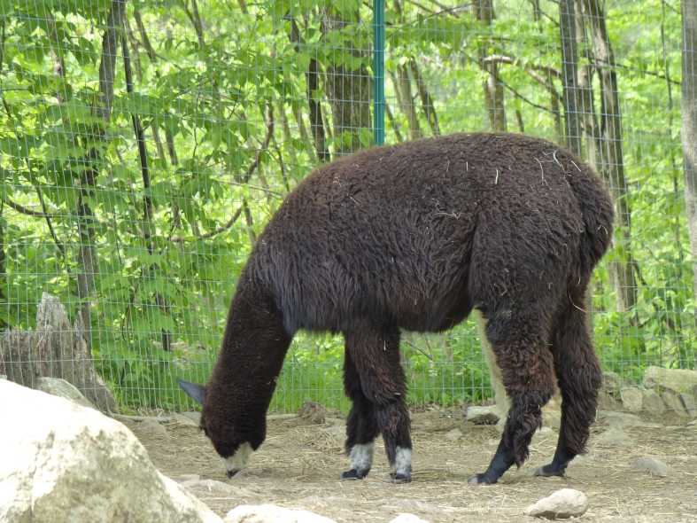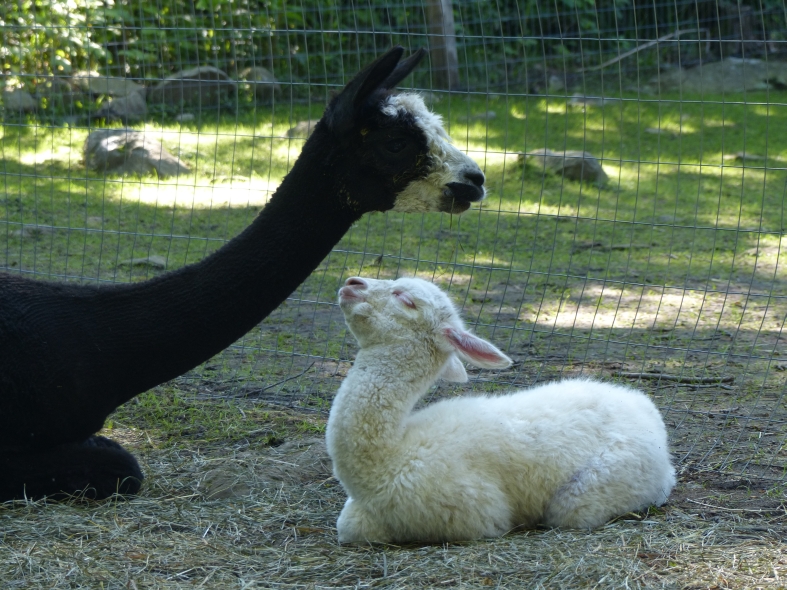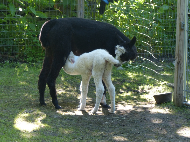 Temperment: Active and spirited. Curious to the point of bold. Resident escape artist Color (phenotype), Gender: fading true black and white adult female (Don't let the bleached tips in the photos fool you! Once she was sheared, she was a beautiful true black underneath! Although I have to say, as a fiber artist, I find the potential uses of her bi-tonal fleece to be inspiring.) Color (genotype): black / black, white spot gene Breed: Huacaya ARI#: 31893275 Sire: Great Rock Incan Prince Dam: Annie Matilda Offspring born into the Pasture Candy herd: Ancestors with 40 or more registered offspring, as of October 2010 (generations back): Peruvian Olympus (2), Brittany's Desperado (3), SA Karrington (5), Peruvian Drambuie G220 (3), Chilean Feliz Fellow (3), SA Emperado (4) Fiber description: Crimpy and wonderfully velvety soft. Soft enough that it is hard to feel it is there! Fiber stats: