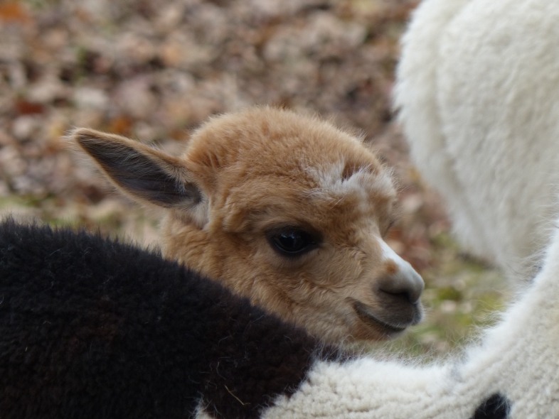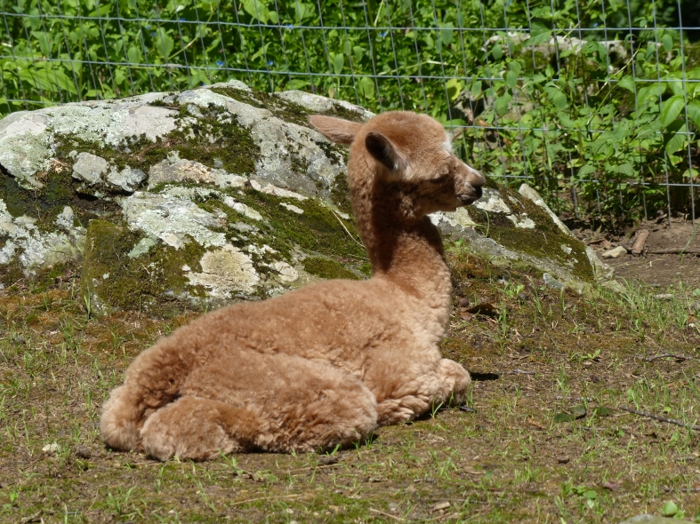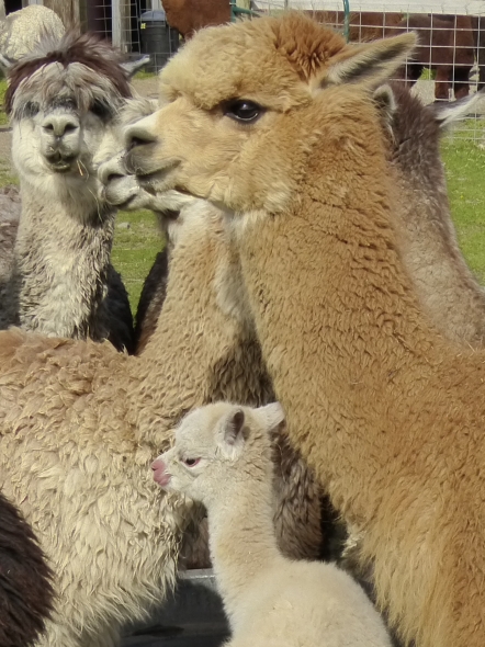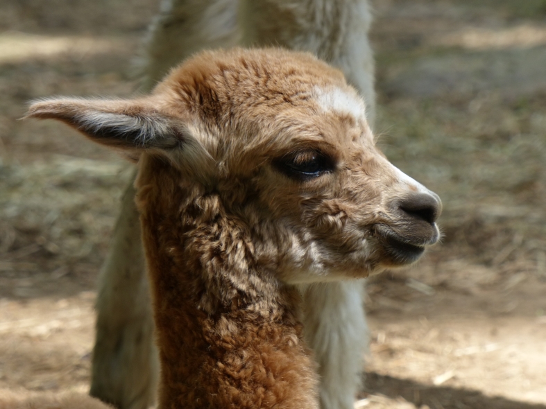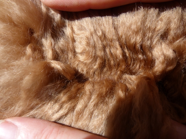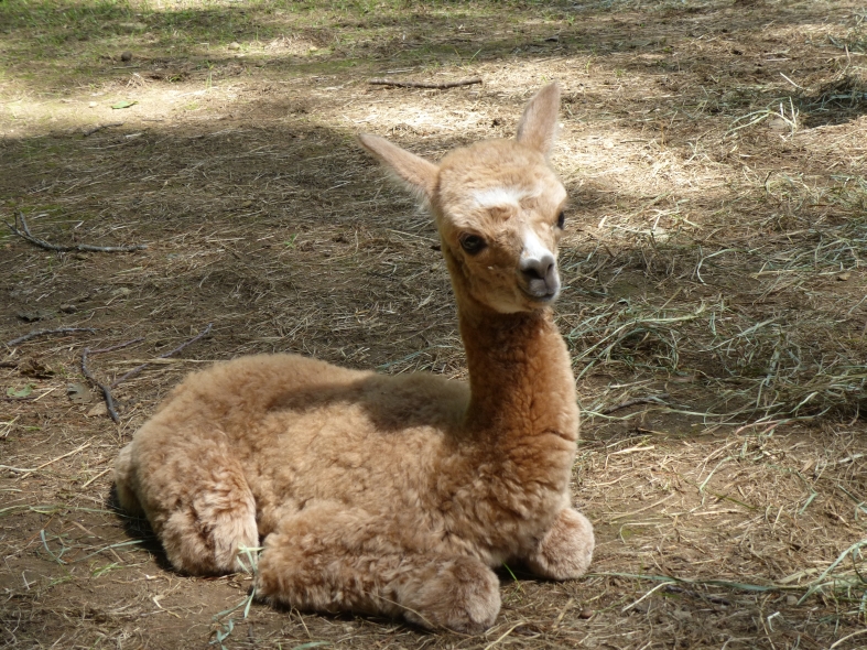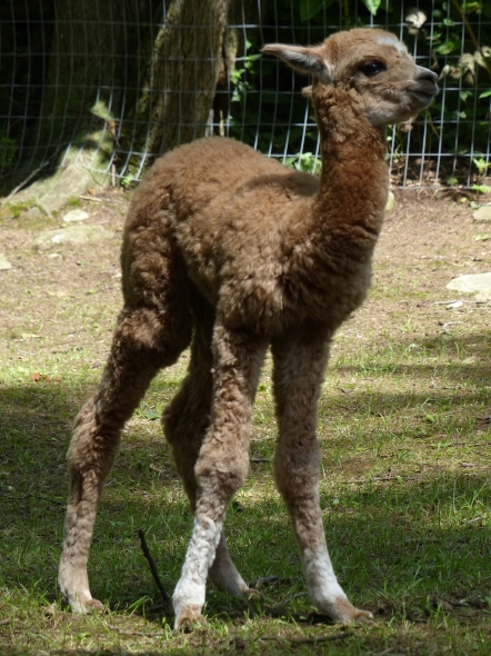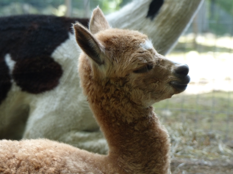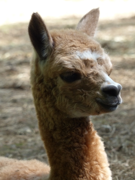 Temperment: alert, cautious Color (phenotype), Gender: medium fawn and white adult female Color (genotype, probable): fawn / either black or brown, white spot gene, dilution gene Breed: Huacaya ARI#: 32791662 Sire: EMA Manchester Dam: TKA Zoey Offspring born into the Pasture Candy herd: Ancestors with 40 or more registered offspring, as of October 2010 (generations back): Pperuvian Guellermo G4546 (4), Peruvian Camilio G4561 (4), Peruvian Ion S221 ALOA (3), Peruvian Fuego G226 (5), Peruvian Hemingway G171 (5), Pperuvian Felix G4562 (5), Ppperuvian El Moustachio 6003 (4), K-2 (3), Mister Antonio (4) Fiber description: Crimpy and soft. Very bright! Unusual strawberry blond color.