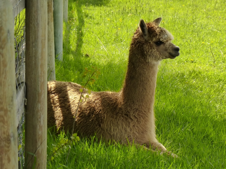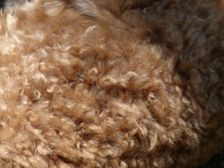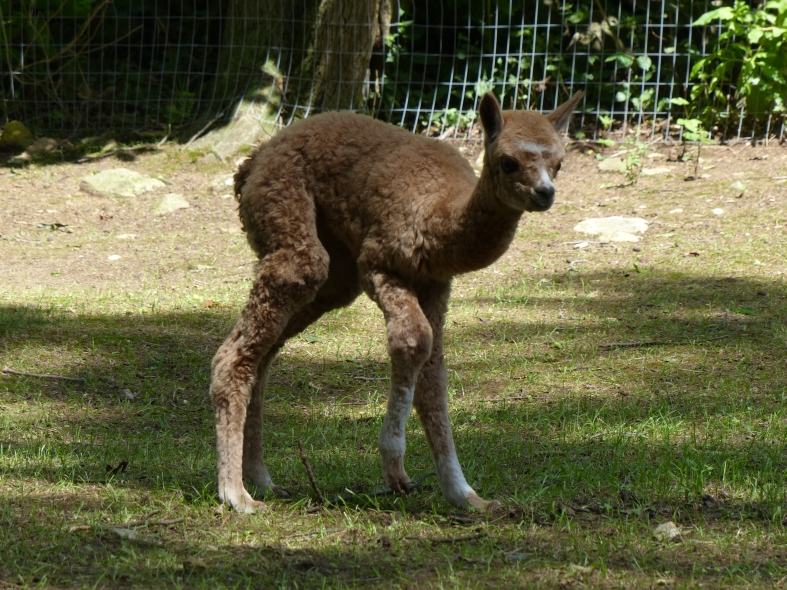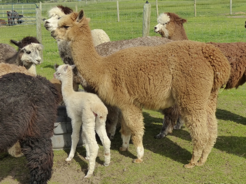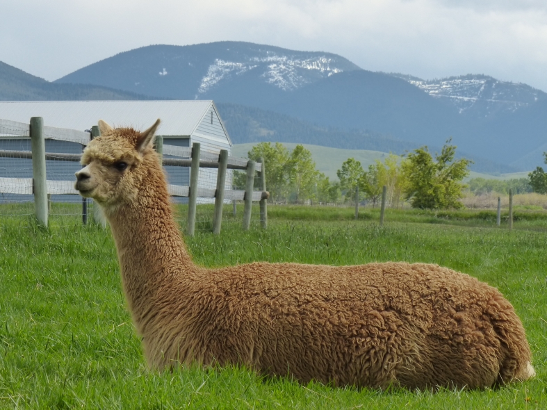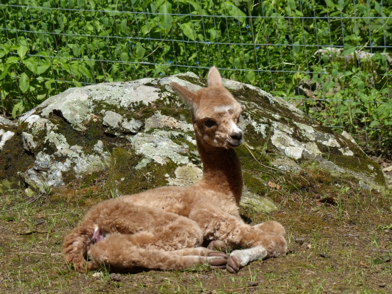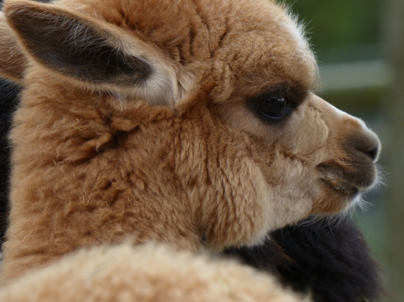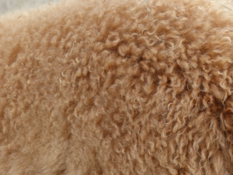 Temperment: alert, cautious Color (phenotype), Gender: medium fawn and white adult female Color (genotype, probable): fawn / either black or brown, white spot gene, dilution gene Breed: Huacaya ARI#: 32791662 Sire: EMA Manchester Dam: TKA Zoey Offspring born into the Pasture Candy herd: Ancestors with 40 or more registered offspring, as of October 2010 (generations back): Pperuvian Guellermo G4546 (4), Peruvian Camilio G4561 (4), Peruvian Ion S221 ALOA (3), Peruvian Fuego G226 (5), Peruvian Hemingway G171 (5), Pperuvian Felix G4562 (5), Ppperuvian El Moustachio 6003 (4), K-2 (3), Mister Antonio (4) Fiber description: Crimpy and soft. Very bright! Unusual strawberry blond color.